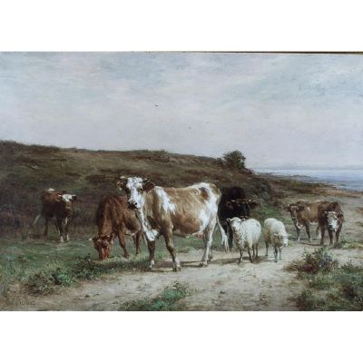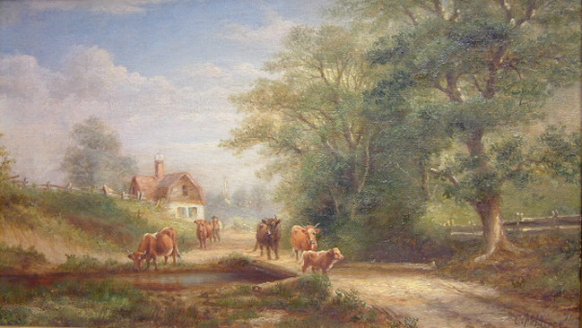 Charles Franklin Pierce was born on April 26th, 1844 in Sharon, New Hampshire to John A. and Phila W. Pierce. He was the third of six children who were raised in the nearby rural community of Peterborough. His early years were spent working on the family farm where the pastoral environment and a multitude of livestock made a deep impression on the future artist. Many of the works of art he would create later on in his life would stem from his familiarity with the farming way of life in the mid 1800s. Cows were one of his favorite subjects.